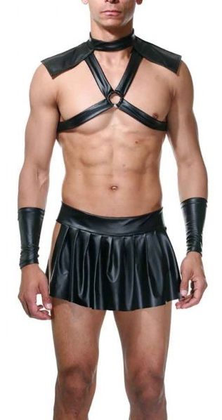 Тематический костюм гладиатора для мужчин, состоящий из четырех предметов: кожаное бюстье на грудь и плечи, юбка и напульсники-рукава. В комплекте: бюстье, юбка, напульсники.