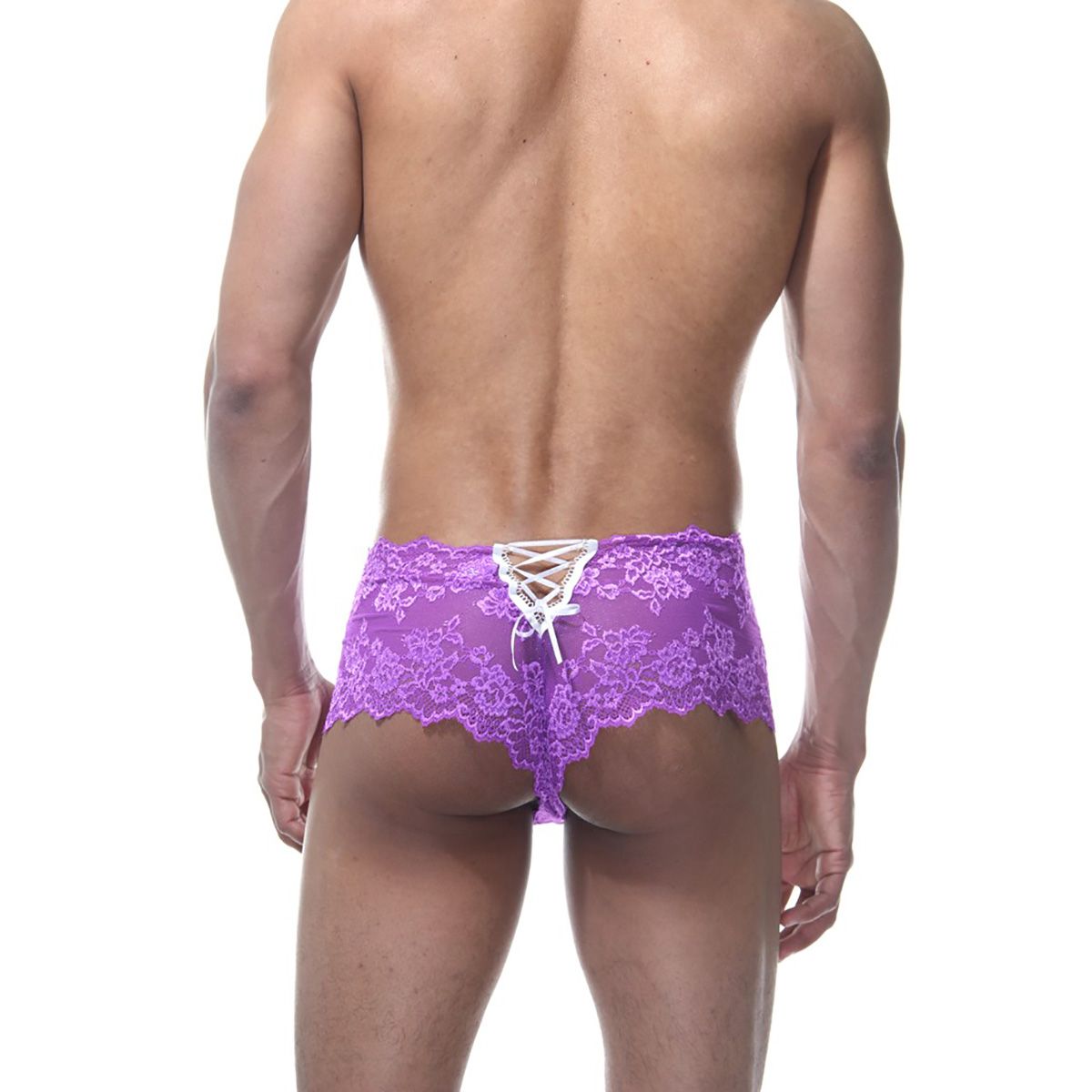 Фиолетовые мужские кружевные трусы. Сделаны из эластичной ткани, поэтому отлично подходят на любой тип фигуры. Яркая расцветка и украшение на ягодицах легко смогут украсить ваше тело.