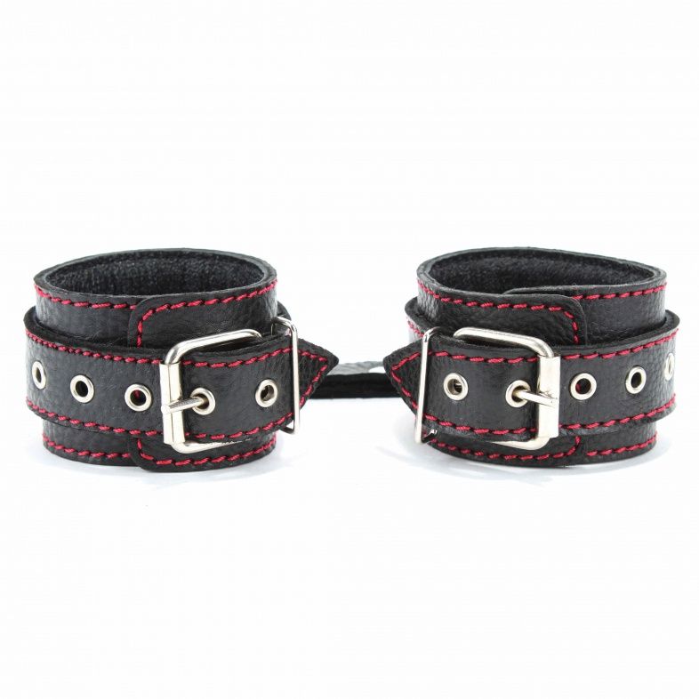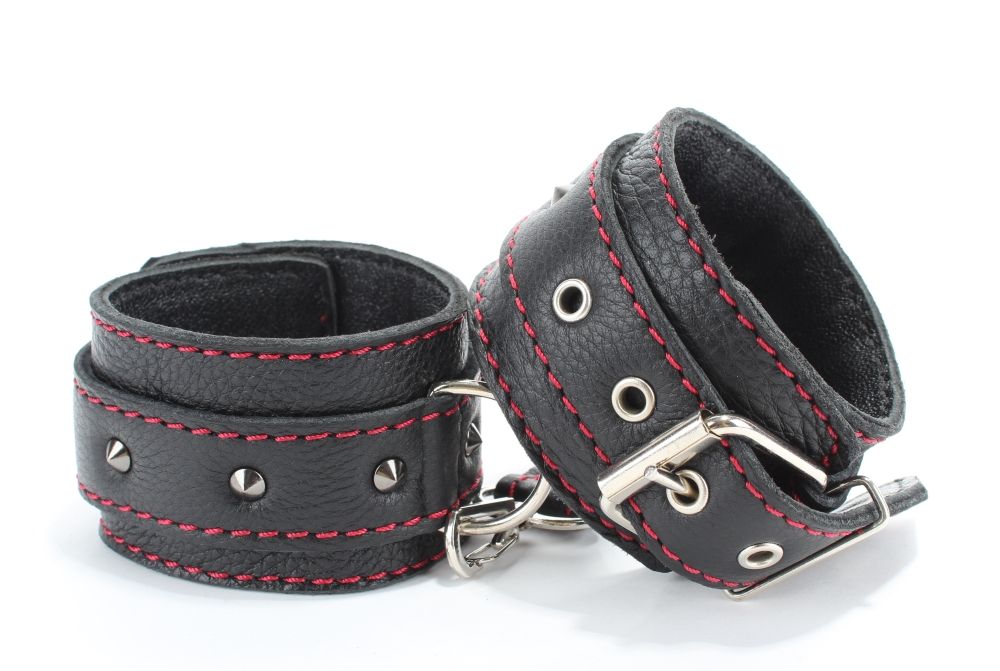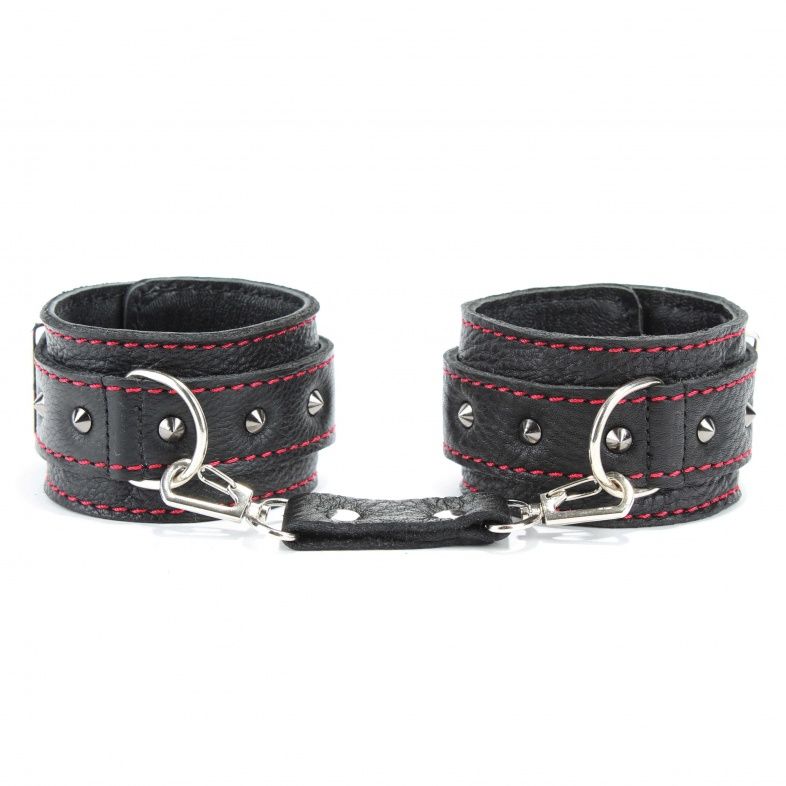 Оживить эротические игры Вам помогут наручники. Этот интимный аксессуар пользуется успехом. Выполненные в черном цвете с красной строчкой и украшены шипами. Модный интимный аксессуар не сдавливает и не нарушает кровообращение, так как изготовлен из мягкой кожи. Чтобы любимая никуда не убежала, наручники соединены короткой перемычкой. Ширина - 5 см.