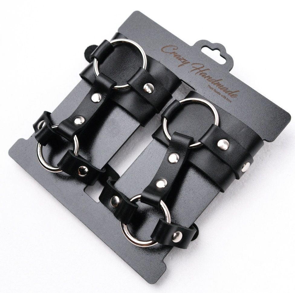 Наручники с креплением на кисть руки выполнены из натуральной кожи. Декорированы заклепками и металлическими кольцами.