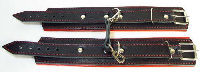 Оковы на ноги с красным подкладом. Выполнены из толстой ременной кожи черного цвета, подклад мягкая перчаточная кожа ярко красного цвета. На пряжке. Использована усиленная металлическая фурнитура. Строчка толстой ниткой контрастного красного цвета.