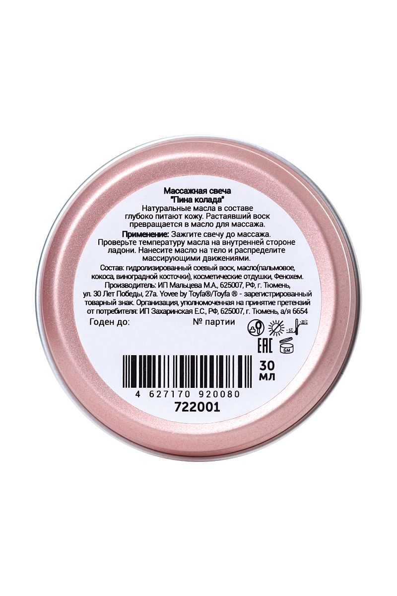 Натуральные масла в составе глубоко питают и увлажняют кожу. Растаявший воск превращается в масло для массажа. Свеча станет идеальным аксессуаром для романтического свидания. Идея для свидания: приготовьте пару коктейлей Пина колада и зажгите массажную свечу. Предложите партнеру расслабиться в ожидании массажа. Погасите свечу и немного подождите, пока масло остынет. Лейте масло вдоль спины медленно, а затем начните с лёгких массирующих движений. Сделайте массаж своим обнаженным телом — так он станет ещё более интимным и чувственным. Такое свидание останется в памяти надолго! Свеча подарит незабываемые ощущения, после которых вам гарантированы нежные и мягкие прикосновения!