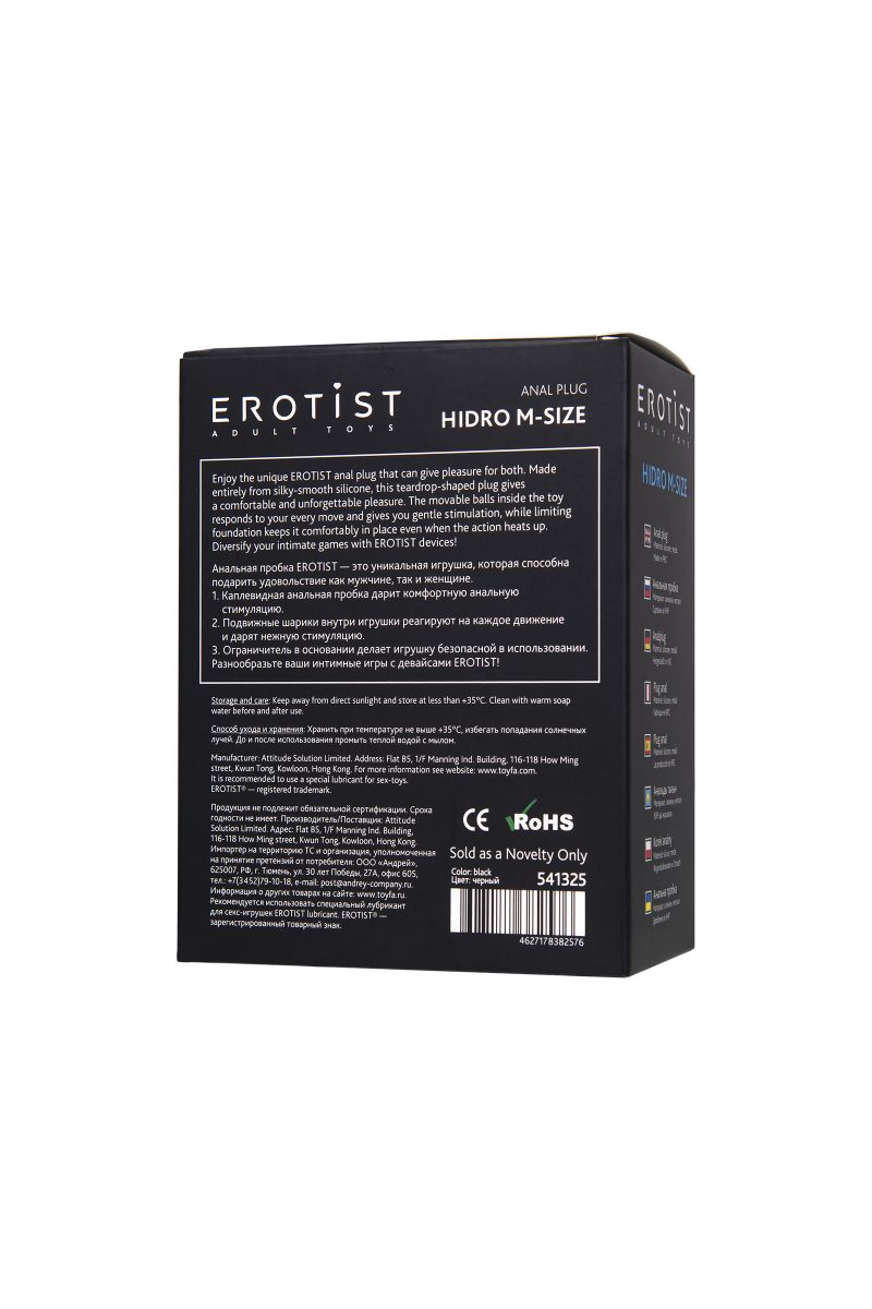 Анальная пробка Hidro - это уникальная игрушка, которая способна подарить удовольствие как мужчине, так и женщине. Каплевидная анальная пробка дарит комфортную анальную стимуляцию. Подвижные шарики внутри игрушки реагируют на каждое движение и дарят нежную стимуляцию. Ограничитель в основании делает игрушку безопасной в использовании. Разнообразьте ваши интимные игры с девайсами EROTIST! Рабочая длина - 8,5 см. Минимальный диаметр - 1,9 см.