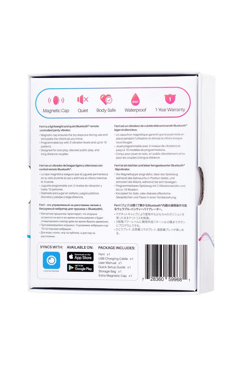 В секс-шопе Orgasmix вы можете купить Розово-черный вибростимулятор в трусики Lovense Ferri артикул 194036 по цене руб. с доставкой в город Ковров. Мы осуществляем доставку по всей России. Ближайшая дата отправки этого товара . Заказы принимаются круглосуточно через интернет-магазин.