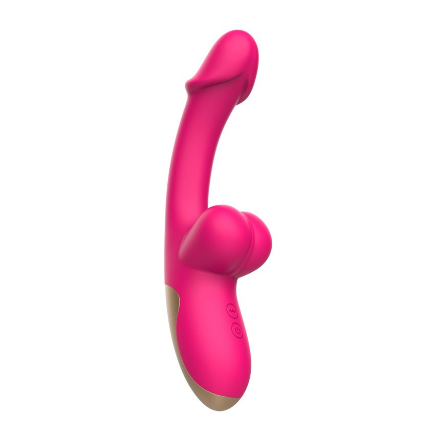 Розовый изогнутый вибромассажёр с имитацией мошонки. 10 режимов вибрации. Рабочая длина - 11 см.